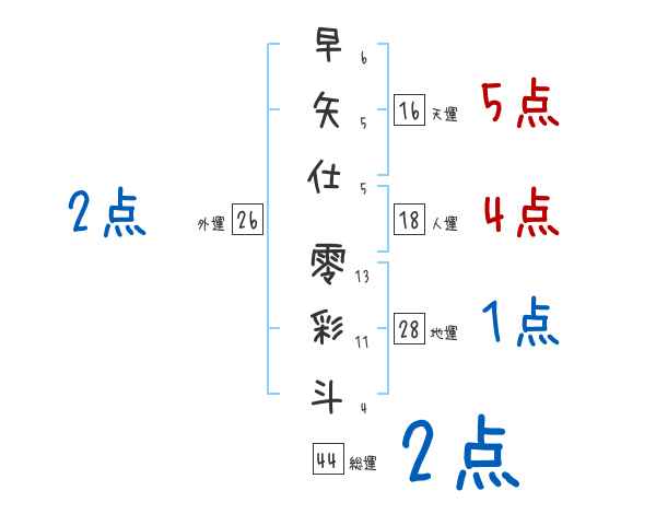 総運![]() | 早矢仕零彩斗さんの総運は44画の2つ星!誠実で慎重な性格。物事を考えすぎないように注意しましょう。 あなたの人生を表す1番重要な運勢です。生涯を通じて影響する総合運となり、主に50歳以降の晩年期に影響を及ぼします。 |