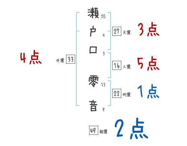 人運![]() | 瀬戸口零音さんの人運は16画の5つ星!人望が厚く大きく発展する。逆転成功が見える。 性格や才能などを表す2番目に重要な運勢です。人間関係や協調性、社会的な成功に影響します。主に20歳から50歳ぐらいまでの中年期の運勢を表します。 |