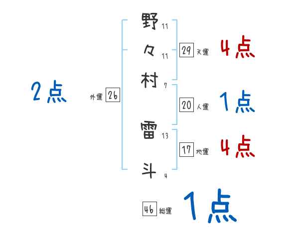 天運![]() | 野々村雷斗さんの天運は29画の4つ星!完全主義で才能がある。厳格な心の持ち主。 家系が持つ宿命的な運勢を表します。祖先から受け継いだ苗字ですので自分の力が及びません。家柄を象徴します。 |