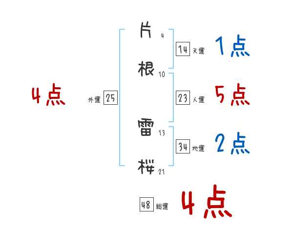 天運![]() | 片根雷桜さんの天運は14画の1つ星!人に対して優しいがストレスを溜め込みがち。人間関係のトラブルを避けるよう気をつけましょう。 家系が持つ宿命的な運勢を表します。祖先から受け継いだ苗字ですので自分の力が及びません。家柄を象徴します。 |