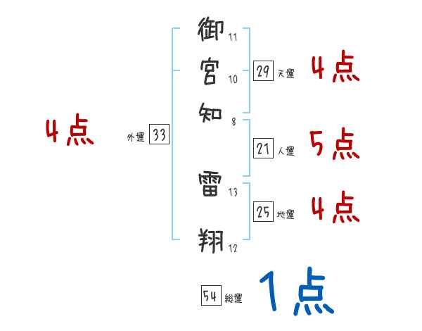 天運![]() | 御宮知雷翔さんの天運は29画の4つ星!完全主義で才能がある。厳格な心の持ち主。 家系が持つ宿命的な運勢を表します。祖先から受け継いだ苗字ですので自分の力が及びません。家柄を象徴します。 |