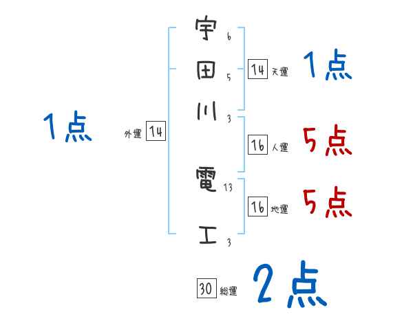 人運![]() | 宇田川電工さんの人運は16画の5つ星!人望が厚く大きく発展する。逆転成功が見える。 性格や才能などを表す2番目に重要な運勢です。人間関係や協調性、社会的な成功に影響します。主に20歳から50歳ぐらいまでの中年期の運勢を表します。 |