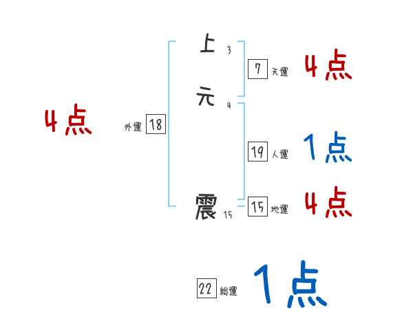 人運![]() | 上元震さんの人運は19画の1つ星!優れた才能を持ちますが、協調性が足りないことも。周りの人と協力する事を意識しましょう。 性格や才能などを表す2番目に重要な運勢です。人間関係や協調性、社会的な成功に影響します。主に20歳から50歳ぐらいまでの中年期の運勢を表します。 |