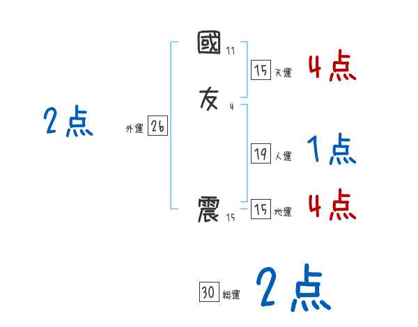 総運![]() | 國友震さんの総運は30画の2つ星!浮き沈みの激しさに注意しましょう。 あなたの人生を表す1番重要な運勢です。生涯を通じて影響する総合運となり、主に50歳以降の晩年期に影響を及ぼします。 |