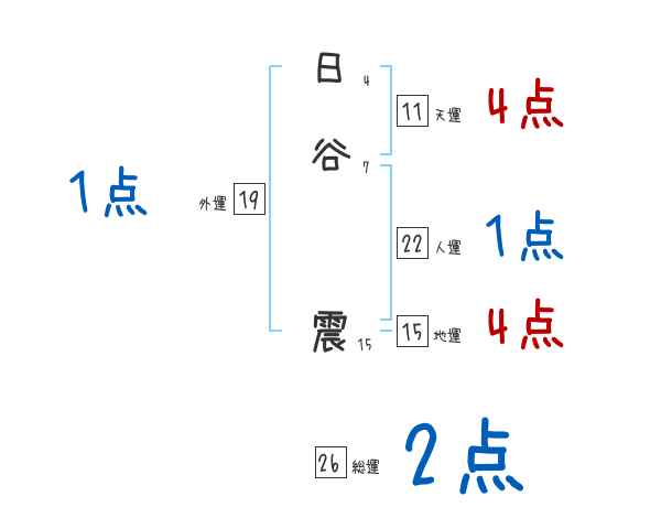 天運![]() | 日谷震さんの天運は11画の4つ星!着実に富や地位を得る幸運な人生。 家系が持つ宿命的な運勢を表します。祖先から受け継いだ苗字ですので自分の力が及びません。家柄を象徴します。 |