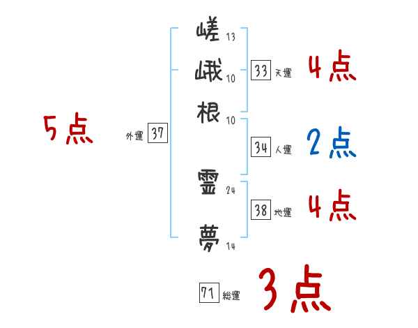天運![]() | 嵯峨根霊夢さんの天運は33画の4つ星!権力志向でプライドが高い。勇気があり運を切り開き成功する。 家系が持つ宿命的な運勢を表します。祖先から受け継いだ苗字ですので自分の力が及びません。家柄を象徴します。 |