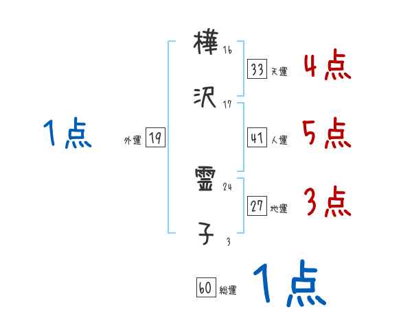 天運![]() | 樺沢霊子さんの天運は33画の4つ星!権力志向でプライドが高い。勇気があり運を切り開き成功する。 家系が持つ宿命的な運勢を表します。祖先から受け継いだ苗字ですので自分の力が及びません。家柄を象徴します。 |