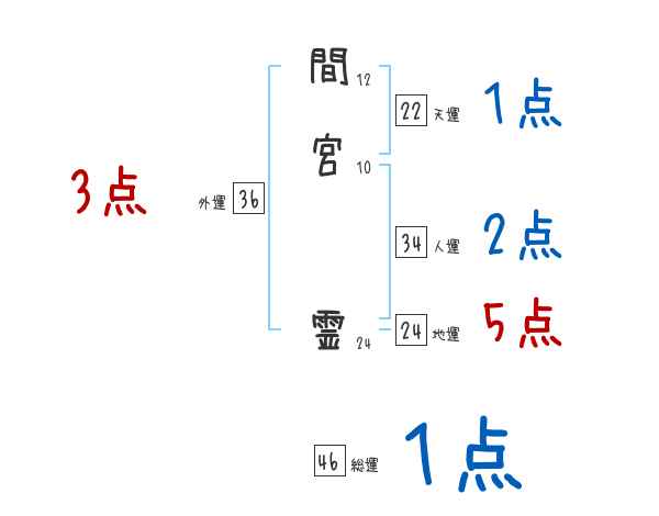 天運![]() | 間宮霊さんの天運は22画の1つ星!努力することが苦手ないっぽう手先が器用。芸術性にも優れる。 家系が持つ宿命的な運勢を表します。祖先から受け継いだ苗字ですので自分の力が及びません。家柄を象徴します。 |