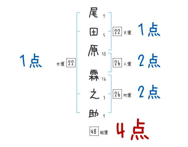 天運![]() | 尾田原霖之助さんの天運は22画の1つ星!努力することが苦手ないっぽう手先が器用。芸術性にも優れる。 家系が持つ宿命的な運勢を表します。祖先から受け継いだ苗字ですので自分の力が及びません。家柄を象徴します。 |
