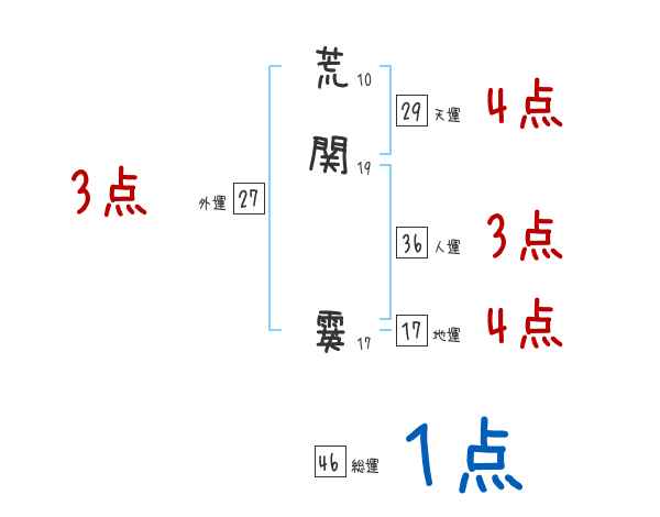 人運![]() | 荒関霙さんの人運は36画の3つ星!先見性が豊かです。多少神経質で苦労することも。 性格や才能などを表す2番目に重要な運勢です。人間関係や協調性、社会的な成功に影響します。主に20歳から50歳ぐらいまでの中年期の運勢を表します。 |