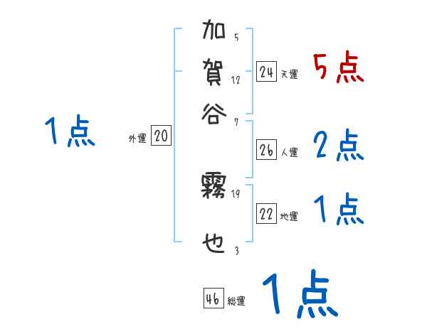 天運![]() | 加賀谷霧也さんの天運は24画の5つ星!家庭運が良く順調な人生。金運にも恵まれる。 家系が持つ宿命的な運勢を表します。祖先から受け継いだ苗字ですので自分の力が及びません。家柄を象徴します。 |