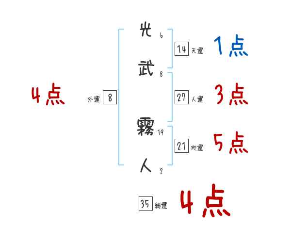 天運![]() | 光武霧人さんの天運は14画の1つ星!人に対して優しいがストレスを溜め込みがち。人間関係のトラブルを避けるよう気をつけましょう。 家系が持つ宿命的な運勢を表します。祖先から受け継いだ苗字ですので自分の力が及びません。家柄を象徴します。 |