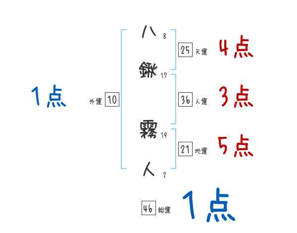 天運![]() | 八鍬霧人さんの天運は25画の4つ星!個性があり才能があふれる。強運の持ち主で発展する。 家系が持つ宿命的な運勢を表します。祖先から受け継いだ苗字ですので自分の力が及びません。家柄を象徴します。 |