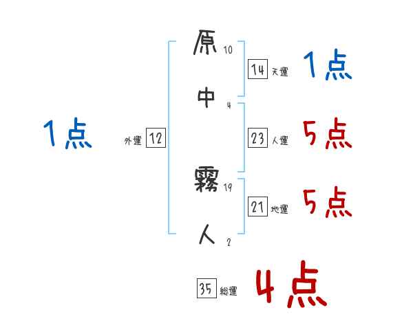 総運![]() | 原中霧人さんの総運は35画の4つ星!温厚な性格で感受性が高い。穏和な性格で人望が厚い。 あなたの人生を表す1番重要な運勢です。生涯を通じて影響する総合運となり、主に50歳以降の晩年期に影響を及ぼします。 |