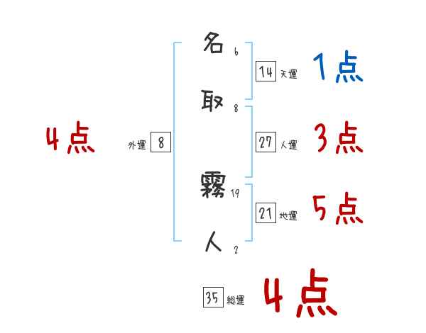 総運![]() | 名取霧人さんの総運は35画の4つ星!温厚な性格で感受性が高い。穏和な性格で人望が厚い。 あなたの人生を表す1番重要な運勢です。生涯を通じて影響する総合運となり、主に50歳以降の晩年期に影響を及ぼします。 |