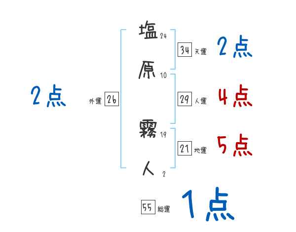 天運![]() | 塩原霧人さんの天運は34画の2つ星!独創性に優れるが、自尊心が強く災難に注意しましょう。 家系が持つ宿命的な運勢を表します。祖先から受け継いだ苗字ですので自分の力が及びません。家柄を象徴します。 |
