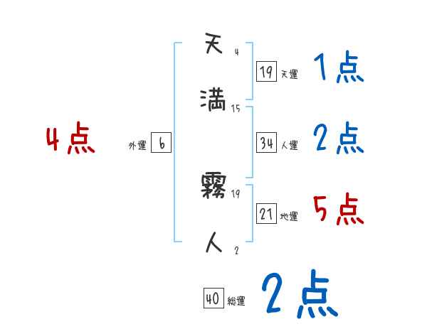 天運![]() | 天満霧人さんの天運は19画の1つ星!優れた才能を持ちますが、協調性が足りないことも。周りの人と協力する事を意識しましょう。 家系が持つ宿命的な運勢を表します。祖先から受け継いだ苗字ですので自分の力が及びません。家柄を象徴します。 |