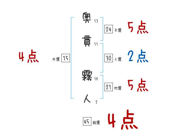天運![]() | 奥貫霧人さんの天運は24画の5つ星!家庭運が良く順調な人生。金運にも恵まれる。 家系が持つ宿命的な運勢を表します。祖先から受け継いだ苗字ですので自分の力が及びません。家柄を象徴します。 |
