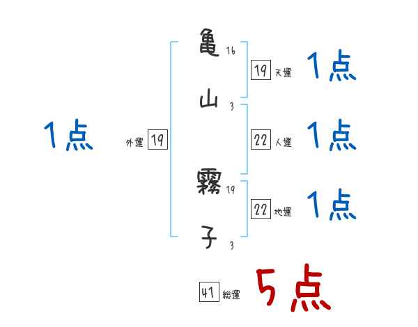 天運![]() | 亀山霧子さんの天運は19画の1つ星!優れた才能を持ちますが、協調性が足りないことも。周りの人と協力する事を意識しましょう。 家系が持つ宿命的な運勢を表します。祖先から受け継いだ苗字ですので自分の力が及びません。家柄を象徴します。 |