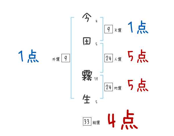 総運![]() | 今田霧生さんの総運は33画の4つ星!権力志向でプライドが高い。勇気があり運を切り開き成功する。 あなたの人生を表す1番重要な運勢です。生涯を通じて影響する総合運となり、主に50歳以降の晩年期に影響を及ぼします。 |