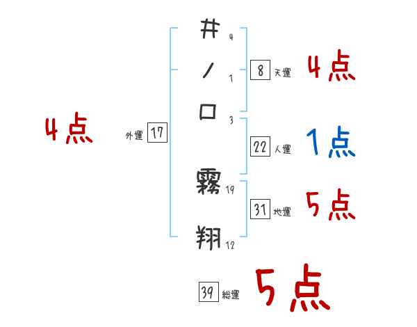 外運![]() | 井ノ口霧翔さんの外運は17画の4つ星!積極的な行動力。地位を気づき財産を手に入れる。純粋な心と直感力。 生活面を象徴する運勢です。外部から受ける影響力を表し、結婚運、家庭運や職場、環境への順応性を表します。 |