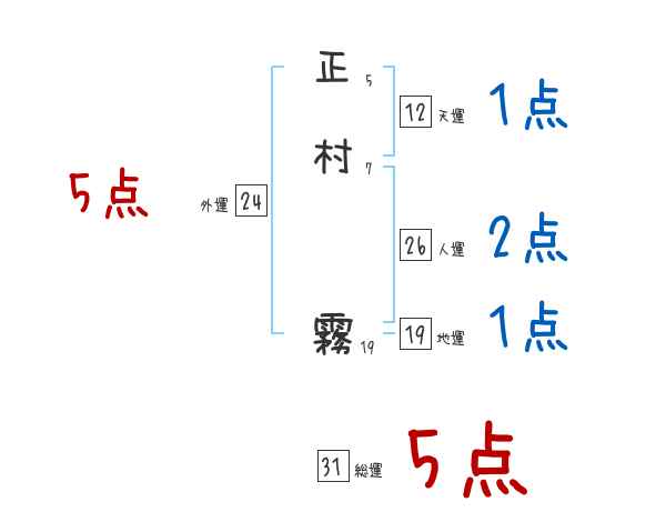 外運![]() | 正村霧さんの外運は24画の5つ星!家庭運が良く順調な人生。金運にも恵まれる。 生活面を象徴する運勢です。外部から受ける影響力を表し、結婚運、家庭運や職場、環境への順応性を表します。 |