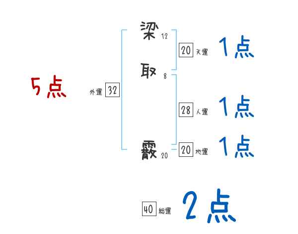 外運![]() | 梁取霰さんの外運は32画の5つ星!柔軟性があり成功する。チャンスが多く金運が良い。 生活面を象徴する運勢です。外部から受ける影響力を表し、結婚運、家庭運や職場、環境への順応性を表します。 |