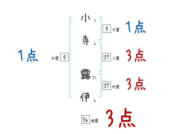 総運![]() | 小寺露伊さんの総運は36画の3つ星!先見性が豊かです。多少神経質で苦労することも。 あなたの人生を表す1番重要な運勢です。生涯を通じて影響する総合運となり、主に50歳以降の晩年期に影響を及ぼします。 |