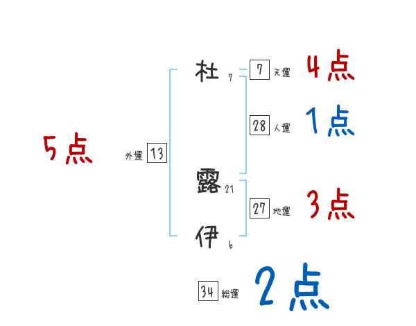 総運![]() | 杜露伊さんの総運は34画の2つ星!独創性に優れるが、自尊心が強く災難に注意しましょう。 あなたの人生を表す1番重要な運勢です。生涯を通じて影響する総合運となり、主に50歳以降の晩年期に影響を及ぼします。 |