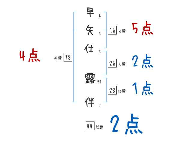 天運![]() | 早矢仕露伴さんの天運は16画の5つ星!人望が厚く大きく発展する。逆転成功が見える。 家系が持つ宿命的な運勢を表します。祖先から受け継いだ苗字ですので自分の力が及びません。家柄を象徴します。 |