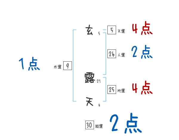 天運![]() | 玄露天さんの天運は5画の4つ星!健康で安泰。協調性に優れ、財産に恵まれる。 家系が持つ宿命的な運勢を表します。祖先から受け継いだ苗字ですので自分の力が及びません。家柄を象徴します。 |