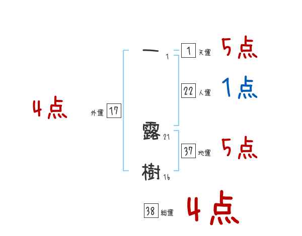 天運![]() | 一露樹さんの天運は1画の5つ星!行動力、指導力があり出世し繁栄する。幸運に恵まれる。 家系が持つ宿命的な運勢を表します。祖先から受け継いだ苗字ですので自分の力が及びません。家柄を象徴します。 |