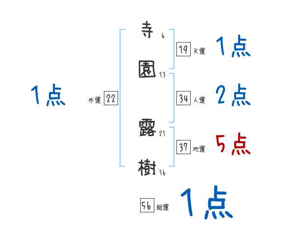総運![]() | 寺園露樹さんの総運は56画の1つ星!消極的で無気力になりがち。誠実な気持ちが必要でしょう。 あなたの人生を表す1番重要な運勢です。生涯を通じて影響する総合運となり、主に50歳以降の晩年期に影響を及ぼします。 |
