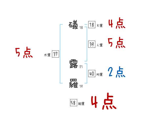 天運![]() | 礒露羅さんの天運は18画の4つ星!情熱的で剛気。忍耐力があり信頼される。 家系が持つ宿命的な運勢を表します。祖先から受け継いだ苗字ですので自分の力が及びません。家柄を象徴します。 |