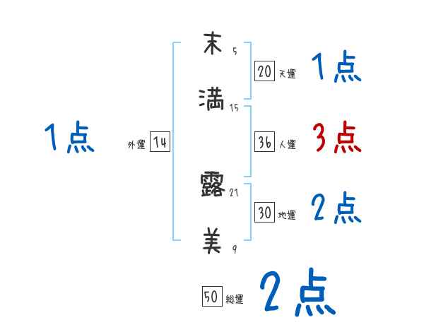 外運![]() | 末満露美さんの外運は14画の1つ星!人に対して優しいがストレスを溜め込みがち。人間関係のトラブルを避けるよう気をつけましょう。 生活面を象徴する運勢です。外部から受ける影響力を表し、結婚運、家庭運や職場、環境への順応性を表します。 |