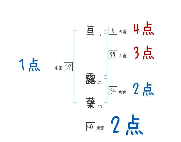 外運![]() | 亘露葉さんの外運は19画の1つ星!優れた才能を持ちますが、協調性が足りないことも。周りの人と協力する事を意識しましょう。 生活面を象徴する運勢です。外部から受ける影響力を表し、結婚運、家庭運や職場、環境への順応性を表します。 |