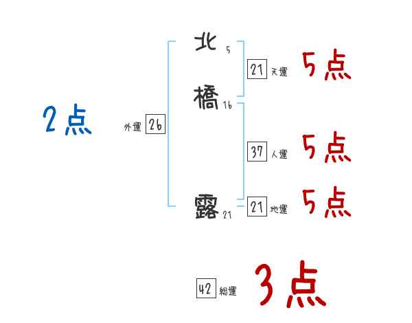 天運![]() | 北橋露さんの天運は21画の5つ星!統率力がある。独立し成功する。名誉を手に入れる。 家系が持つ宿命的な運勢を表します。祖先から受け継いだ苗字ですので自分の力が及びません。家柄を象徴します。 |