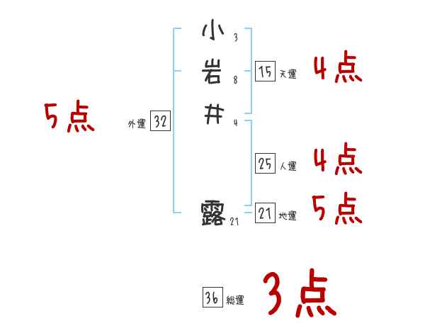 外運![]() | 小岩井露さんの外運は32画の5つ星!柔軟性があり成功する。チャンスが多く金運が良い。 生活面を象徴する運勢です。外部から受ける影響力を表し、結婚運、家庭運や職場、環境への順応性を表します。 |