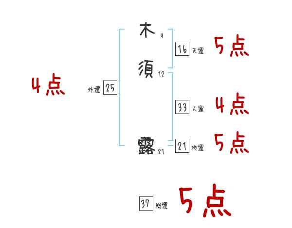 総運![]() | 木須露さんの総運は37画の5つ星!努力家で順応性に優れる。現実的な考え方ができ忠実に物事をこなす。 あなたの人生を表す1番重要な運勢です。生涯を通じて影響する総合運となり、主に50歳以降の晩年期に影響を及ぼします。 |