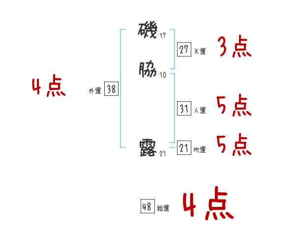 外運![]() | 磯脇露さんの外運は38画の4つ星!温厚な性格で技術的な才能を発揮する。職人的な仕事に向いている。 生活面を象徴する運勢です。外部から受ける影響力を表し、結婚運、家庭運や職場、環境への順応性を表します。 |