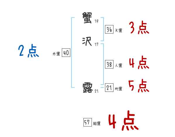 外運![]() | 蟹沢露さんの外運は40画の2つ星!自信過剰で物事に固執するためトラブルに注意。 生活面を象徴する運勢です。外部から受ける影響力を表し、結婚運、家庭運や職場、環境への順応性を表します。 |