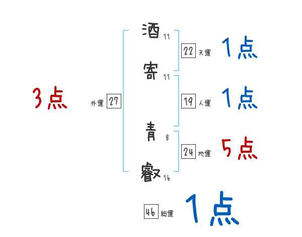 外運![]() | 酒寄青叡さんの外運は27画の3つ星!頭脳明晰だが強情で摩擦が多い傾向。孤立に注意。 生活面を象徴する運勢です。外部から受ける影響力を表し、結婚運、家庭運や職場、環境への順応性を表します。 |
