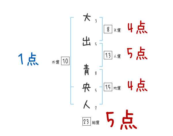 人運![]() | 大出青央人さんの人運は13画の5つ星!才能に恵まれ人気がある。名声を手に入れる。円満な人生。 性格や才能などを表す2番目に重要な運勢です。人間関係や協調性、社会的な成功に影響します。主に20歳から50歳ぐらいまでの中年期の運勢を表します。 |