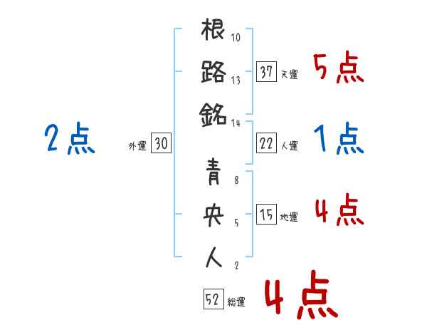 外運![]() | 根路銘青央人さんの外運は30画の2つ星!浮き沈みの激しさに注意しましょう。 生活面を象徴する運勢です。外部から受ける影響力を表し、結婚運、家庭運や職場、環境への順応性を表します。 |