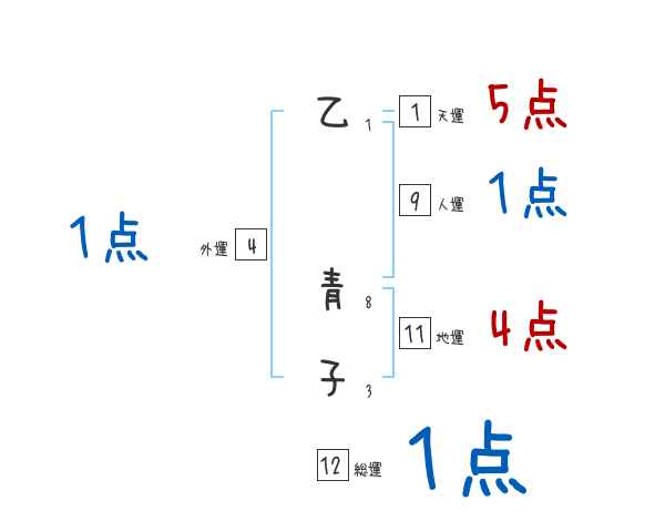 天運![]() | 乙青子さんの天運は1画の5つ星!行動力、指導力があり出世し繁栄する。幸運に恵まれる。 家系が持つ宿命的な運勢を表します。祖先から受け継いだ苗字ですので自分の力が及びません。家柄を象徴します。 |