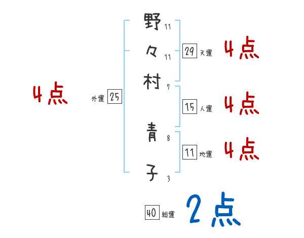 天運![]() | 野々村青子さんの天運は29画の4つ星!完全主義で才能がある。厳格な心の持ち主。 家系が持つ宿命的な運勢を表します。祖先から受け継いだ苗字ですので自分の力が及びません。家柄を象徴します。 |