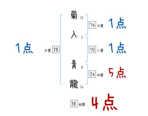 天運![]() | 菊入青龍さんの天運は14画の1つ星!人に対して優しいがストレスを溜め込みがち。人間関係のトラブルを避けるよう気をつけましょう。 家系が持つ宿命的な運勢を表します。祖先から受け継いだ苗字ですので自分の力が及びません。家柄を象徴します。 |