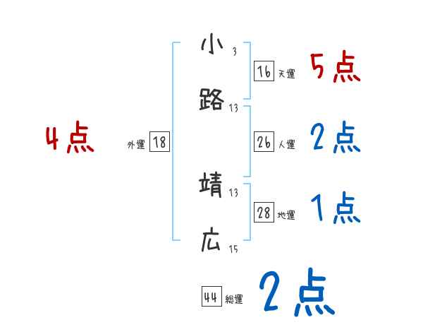 総運![]() | 小路靖広さんの総運は44画の2つ星!誠実で慎重な性格。物事を考えすぎないように注意しましょう。 あなたの人生を表す1番重要な運勢です。生涯を通じて影響する総合運となり、主に50歳以降の晩年期に影響を及ぼします。 |