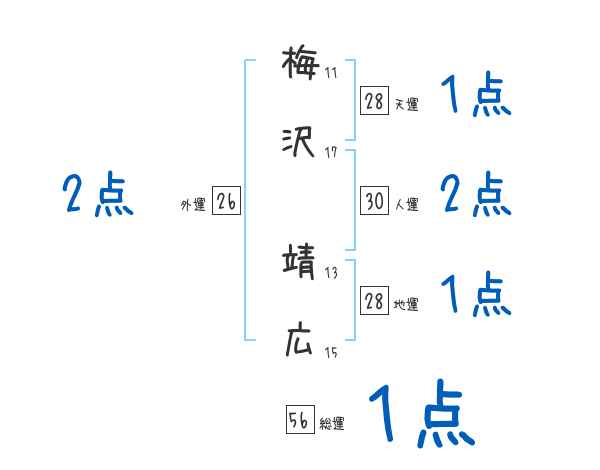 外運![]() | 梅沢靖広さんの外運は26画の2つ星!波瀾万丈かも。信頼できる人を大事にしましょう。 生活面を象徴する運勢です。外部から受ける影響力を表し、結婚運、家庭運や職場、環境への順応性を表します。 |