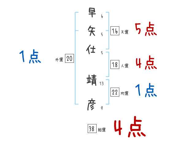 天運![]() | 早矢仕靖彦さんの天運は16画の5つ星!人望が厚く大きく発展する。逆転成功が見える。 家系が持つ宿命的な運勢を表します。祖先から受け継いだ苗字ですので自分の力が及びません。家柄を象徴します。 |